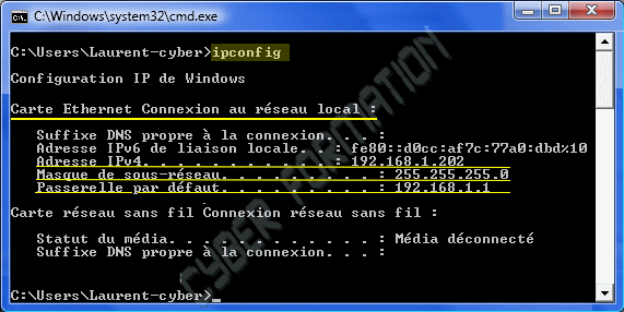 | - IPConfig /all (renvoie plus d'informations de configuration IP, notamment l'état DHCP, l'adresse physique de la carte réseau, les DNS...) | Voir